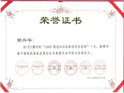 在论坛优秀论文颁奖典礼上,长泰公司赖兴华撰写的《1200T浆包加压机的优化及改进》被评选为优秀论文。