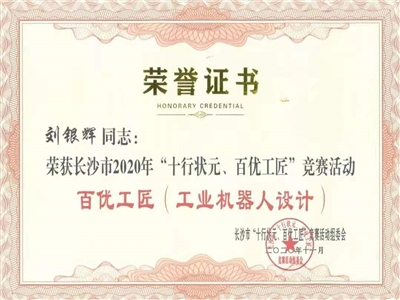 11月28日,长沙市总工会在市会议中心召开长沙市2020年“十行状元、百优工匠”技能竞赛活动总结表彰会。长泰公司人工智能研究部庄海龙、智能装备事业部刘银辉组成的工业机器人设计小组被授予“百优工匠”荣誉称号!