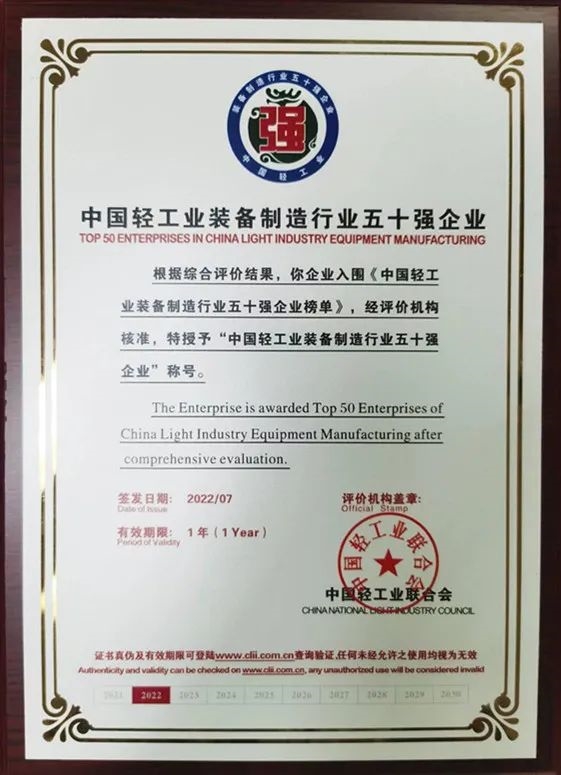 中国轻工装备制造行业强企排行评价榜单始于2017年,是中国轻工业联合会贯彻国家加强科技创新、培育具有全球竞争力一流企业,建设制造强国系列战略部署的重要举措。中国轻工业联合会对企业的营业收入、利润总额、主营业务收入利润率、主营业务收入增速、研发投入、专利数量、自主品牌建设、主要客户群体八项指标综合评分,按统一标准体系进行评价。排行评价榜单实行动态管理,每年发布一次,科学公正,权威性高,充分展现企业综合实力、品牌价值。中轻长泰在轻工行业深耕23年,一直致力于为客户提供整体解决方案,致力于轻工行业“五基”先进基础工艺绿色研究,走“专特优精”发展道路,引领行业发展。