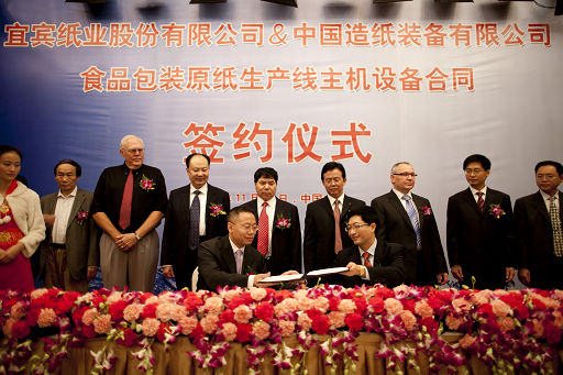 中国造纸装备公司董事长、总经理马思一、宜宾纸业董事长易从分别代表双方公司致辞,宜宾纸业总裁王晓华和装备公司副总经理周后炼代表双方签署合同文本。