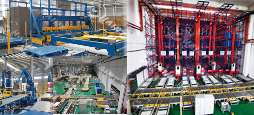 智能化成品处理系统包括纸箱码垛、缠膜、托盘植入、贴标、整形、成品立体库等。