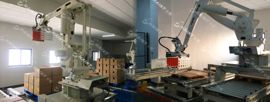 箱件智能码垛系统可适用于多规格纸箱码垛,通过夹具上的气缸驱动夹板夹取纸箱,勾爪托底,将纸箱码放到指定托盘上,并可在PC客户端对垛型数据进行改动设置,以满足码垛需求。